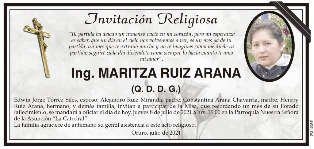 Edwin Jorge Tórrez Siles, esposo; Alejandro Ruiz Miranda, padre; Constantina Arana Chavarría, madre; Henrry Ruiz Arana, hermano; y demás familia, invitan a participar de la Misa, que recordando un mes de su llorado fallecimiento, se mandará a oficiar el día de hoy, jueves 8 de julio de 2021 a hrs. 15:00 en la Parroquia Nuestra Señora de la Asunción “La Catedral”.