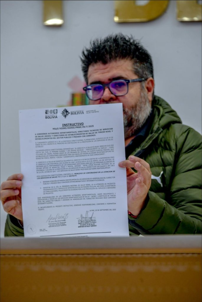 “Frente a esto, nosotros como Ministerio de Salud y Deportes contamos con el presupuesto suficiente y realizamos las gestiones administrativas en las diferentes instancias para poder asegurar el pago y garantizar la atención de los pacientes renales”, indicó Humacayo. Sdenka Mauri, jefa del Programa Nacional de Salud Renal, aseguró que las supervisiones confirmaron que la atención se realiza sin interrupciones.