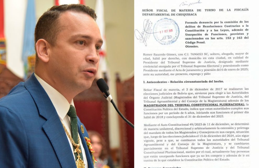 El presidente del Tribunal Supremo de Justicia (TSJ), Romer Saucedo Gómez, ha presentado una denuncia formal ante la Fiscalía Departamental de Chuquisaca. En esta denuncia, acusa a cinco magistrados prorrogados del Tribunal Constitucional Plurinacional (TCP) de presuntos delitos relacionados con resoluciones que van en contra de la Constitución y las leyes, así como de usurpación de funciones. Esta información fue publicada por la agencia judicial de noticias.