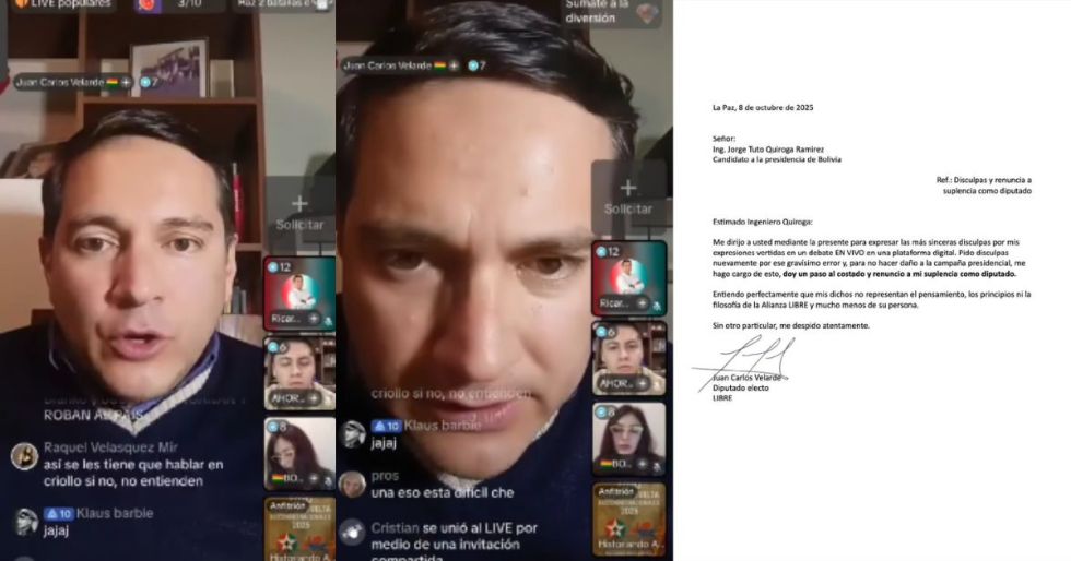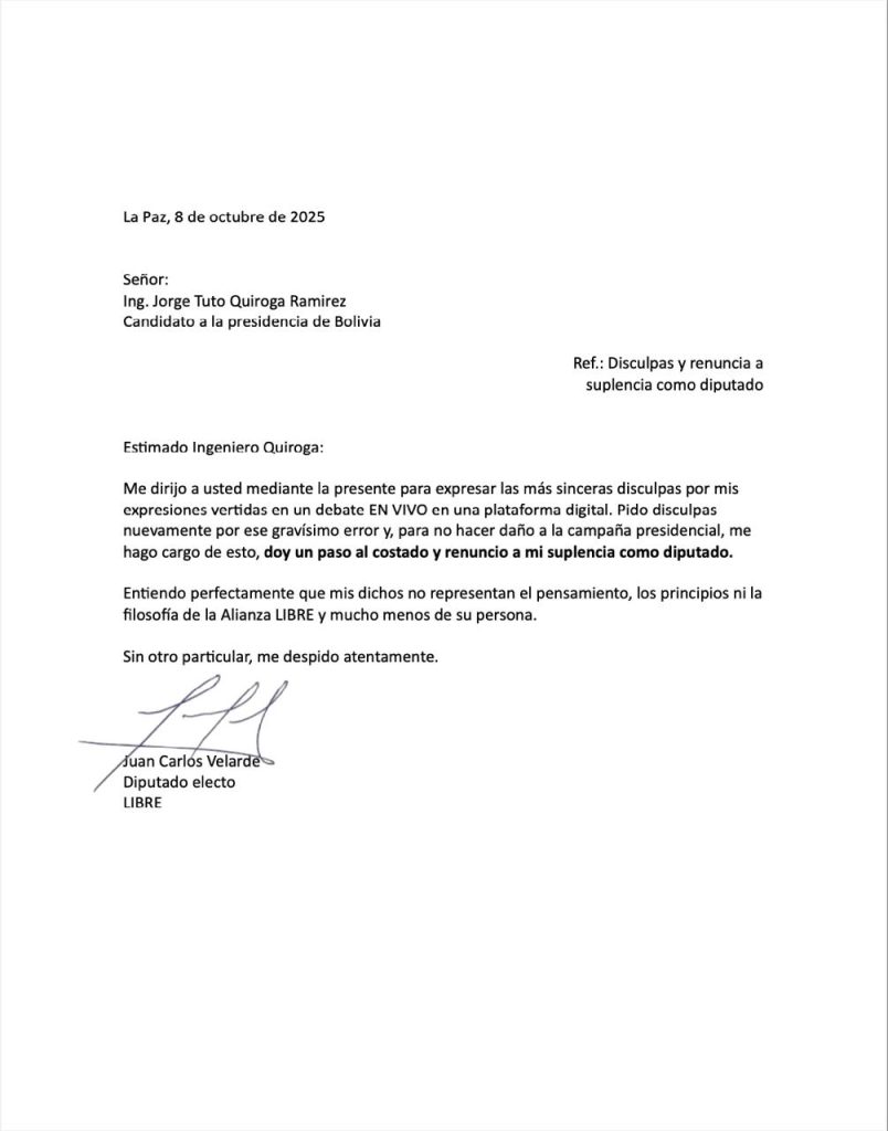 En su carta de disculpas, dirigida al candidato presidencial Jorge Tuto Quiroga, Velarde asumió la responsabilidad de sus declaraciones y afirmó que no reflejan los principios de su agrupación.