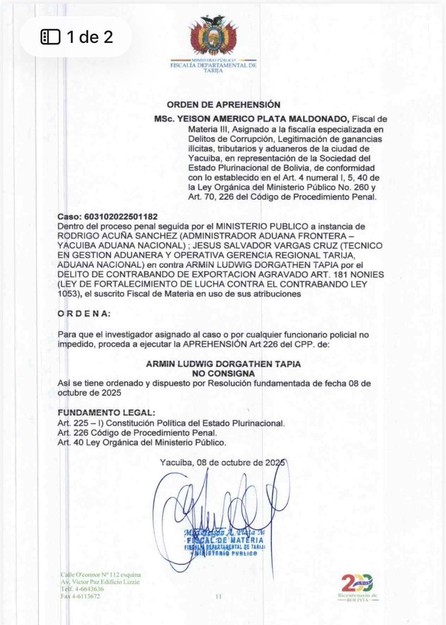 La investigación está siendo dirigida por el fiscal Yeison Américo Plata Maldonado, quien pertenece a la Fiscalía Especializada en Delitos de Corrupción, Legitimación de Ganancias Ilícitas, Tributarios y Aduaneros en Yacuiba. El documento judicial que se ha emitido instruye al investigador asignado al caso, así como a cualquier funcionario policial, a proceder con la aprehensión de Armin Ludwig Dorgathen Tapia.