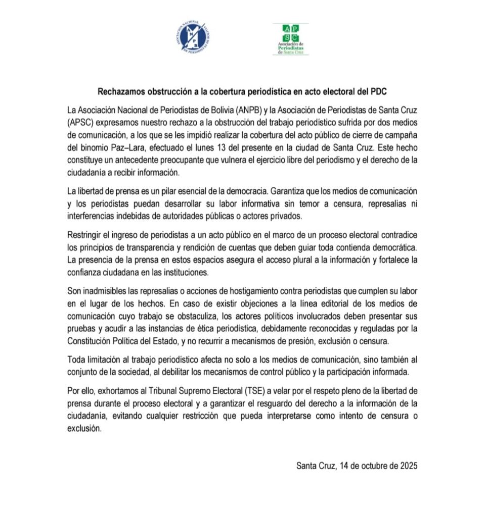 La Asociación Nacional de Periodistas de Bolivia (ANPB) y la Asociación de Periodistas de Santa Cruz (APSC) han expresado su rechazo ante la obstrucción que sufrieron periodistas durante el acto de cierre de campaña del binomio Paz–Lara del Partido Demócrata Cristiano (PDC).