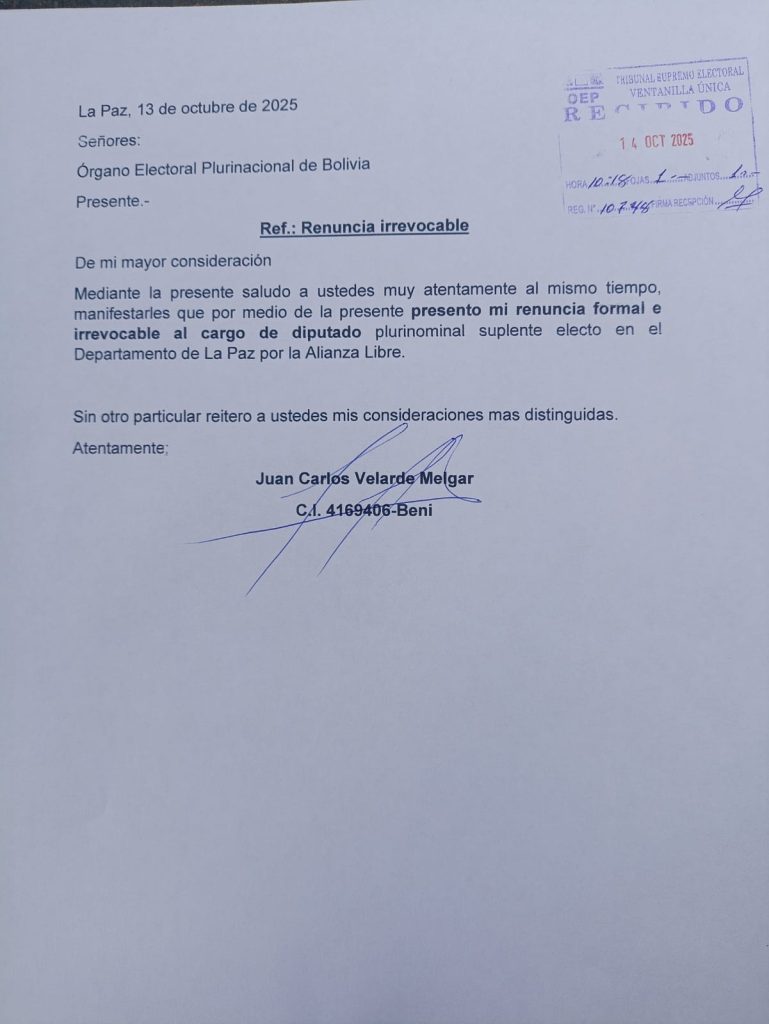 El diputado suplente electo por la Alianza Libre, Juan Carlos Velarde, presentó su renuncia irrevocable al cargo ante el Tribunal Supremo Electoral (TSE) este martes 14 de octubre.