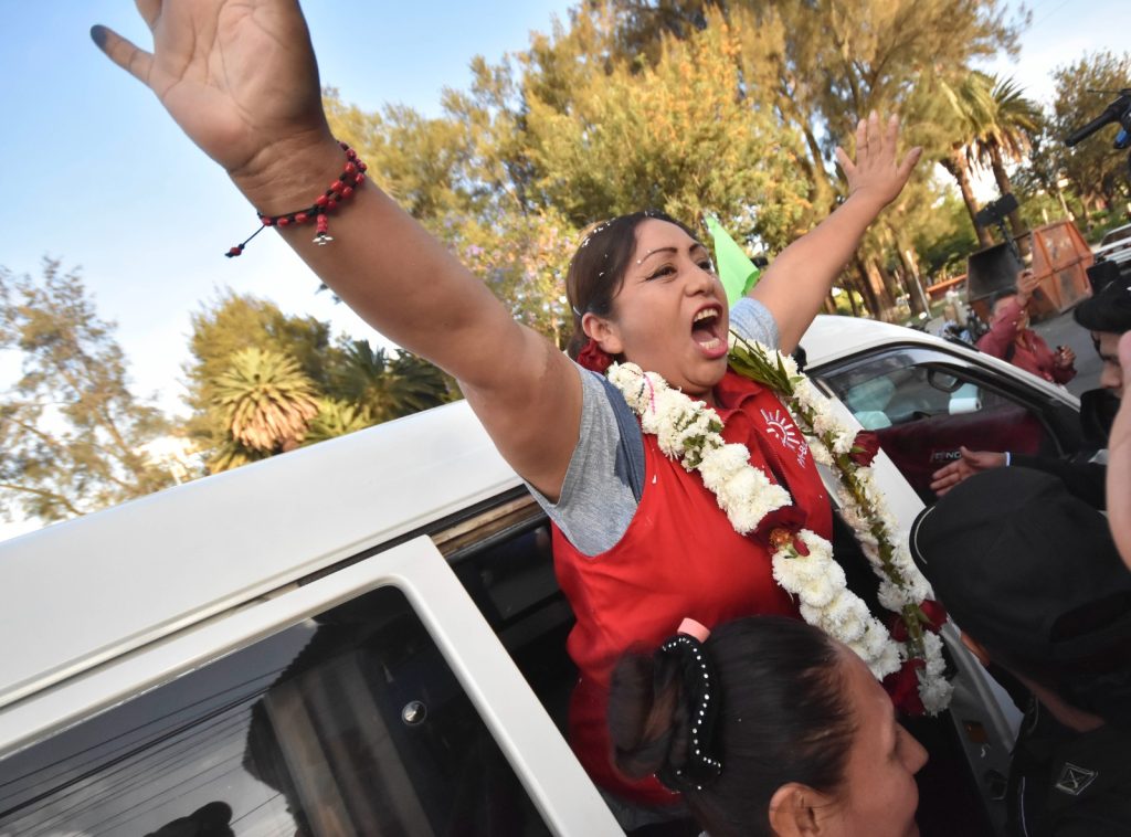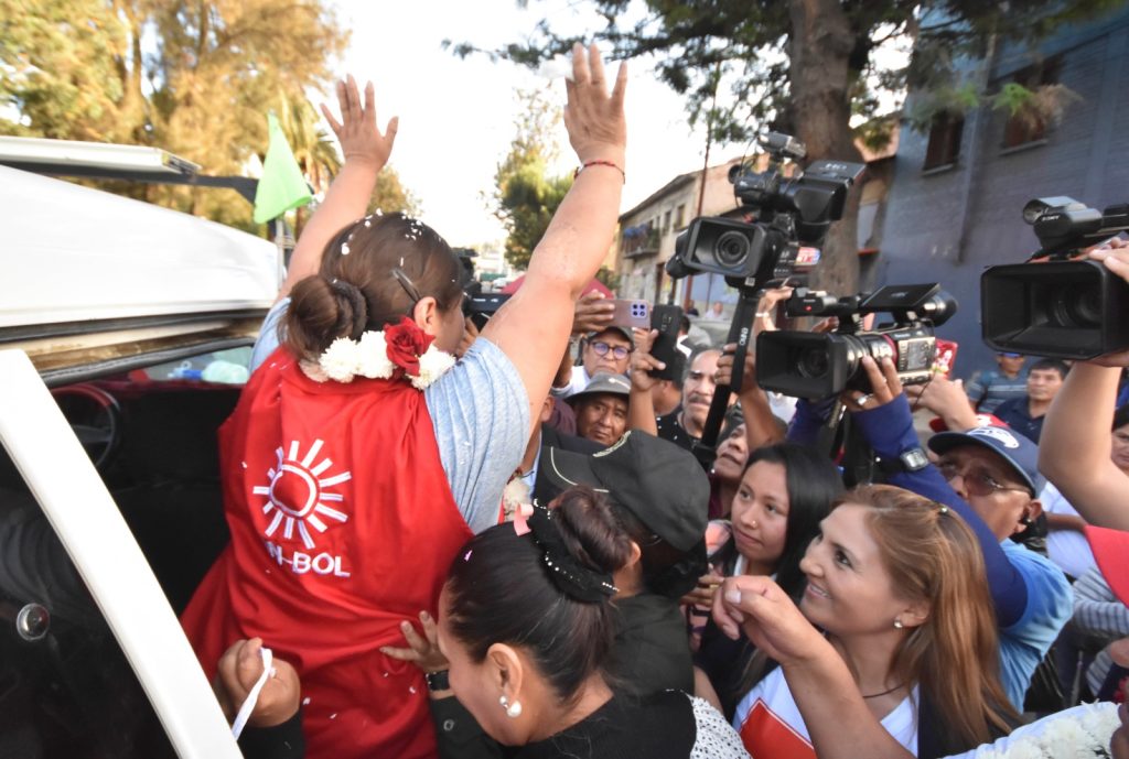 Nina fue recibida con una banda de música y guirnaldas por dirigentes del llamado “evismo” en Cochabamba. Al salir, la exdirigente expresó que su encarcelamiento solo sirvió para fortalecer su convicción, según informó Unitel.
