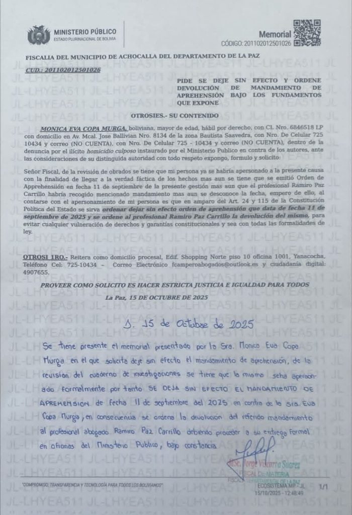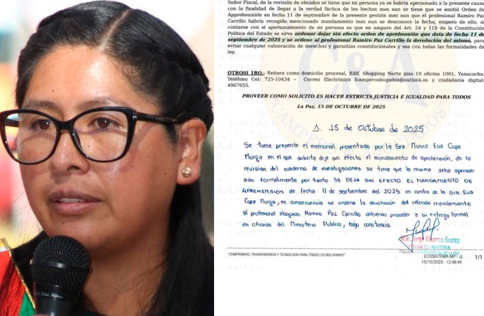 “Se deja sin efecto el mandamiento de aprehensión de fecha 11 de septiembre de 2025 en contra de la señora Eva Copa Murga; en consecuencia, se ordena la devolución del referido mandamiento al profesional abogado Ramiro Paz Carrillo, debiendo proceder a su entrega formal en oficinas del Ministerio Público, bajo constancia”, señala el documento firmado por el fiscal de materia Jorge Viscarra Suárez, de la Fiscalía Departamental de La Paz.