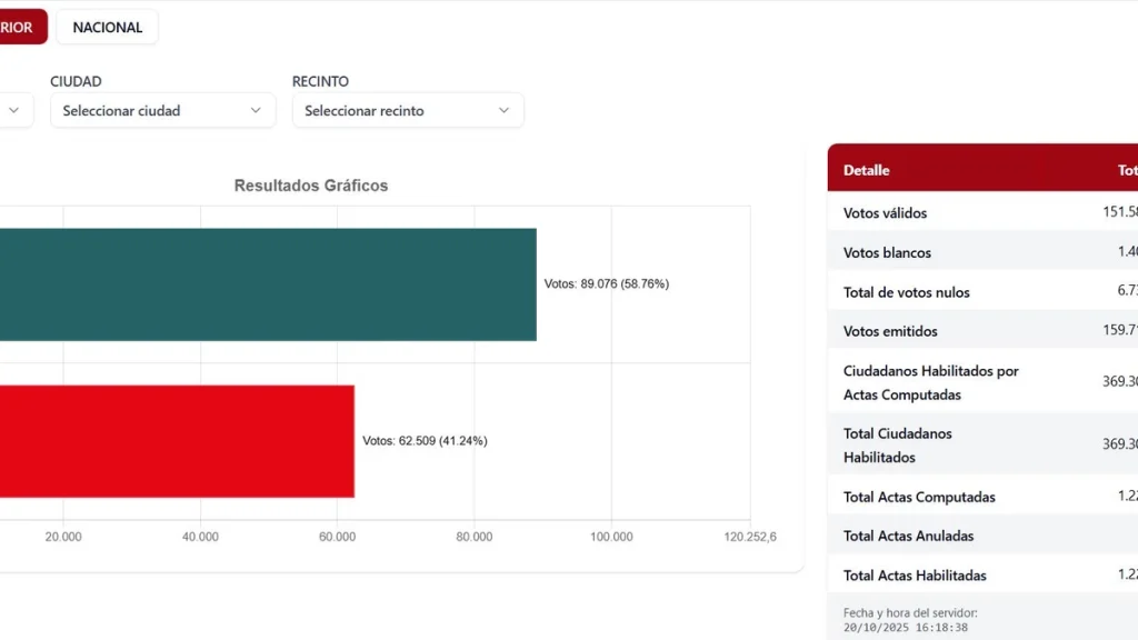 El conteo del voto exterior que realizaba el Tribunal Supremo Electoral (TSE) terminó favoreciendo al binomio Paz-Lara. Al 100% del cómputo, Rodrigo Paz (PDC) se impuso con un 58,76% del total de votos de los compatriotas en terceros países. En contraste, el binomio perdedor, conformado por Quiroga y Velasco, recibió el 41,24% de los votos.