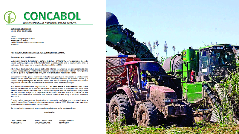 “A la fecha, la deuda acumulada supera los 300.000.000 de bolivianos, con una mora que sobrepasa los 60 días, situación inaceptable que está llevando al sector a una asfixia económica insostenible y empujando a una crisis a quienes representamos el 60,60% de la producción nacional de etanol”, señala la misiva de Concabol.