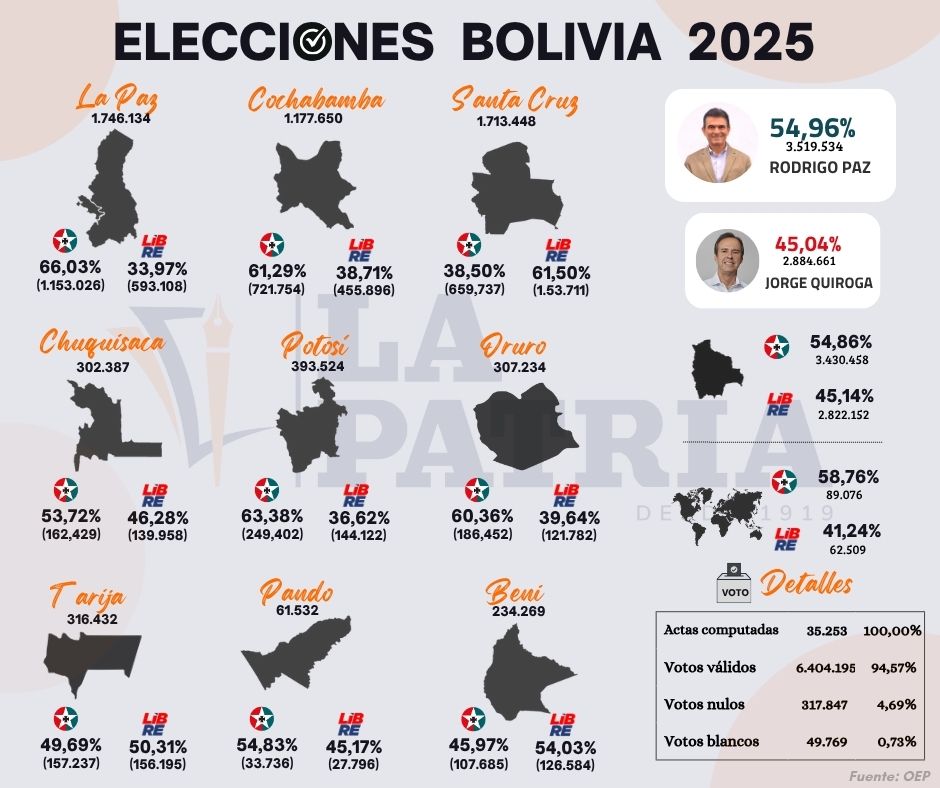 El Tribunal Supremo Electoral (TSE) de Bolivia anunció este jueves 23 de octubre de 2025 que ha finalizado el cómputo oficial de la segunda vuelta electoral para elegir al presidente y vicepresidente del Estado Plurinacional. Con esto, se confirma la validez de los resultados y la transparencia del proceso electoral.