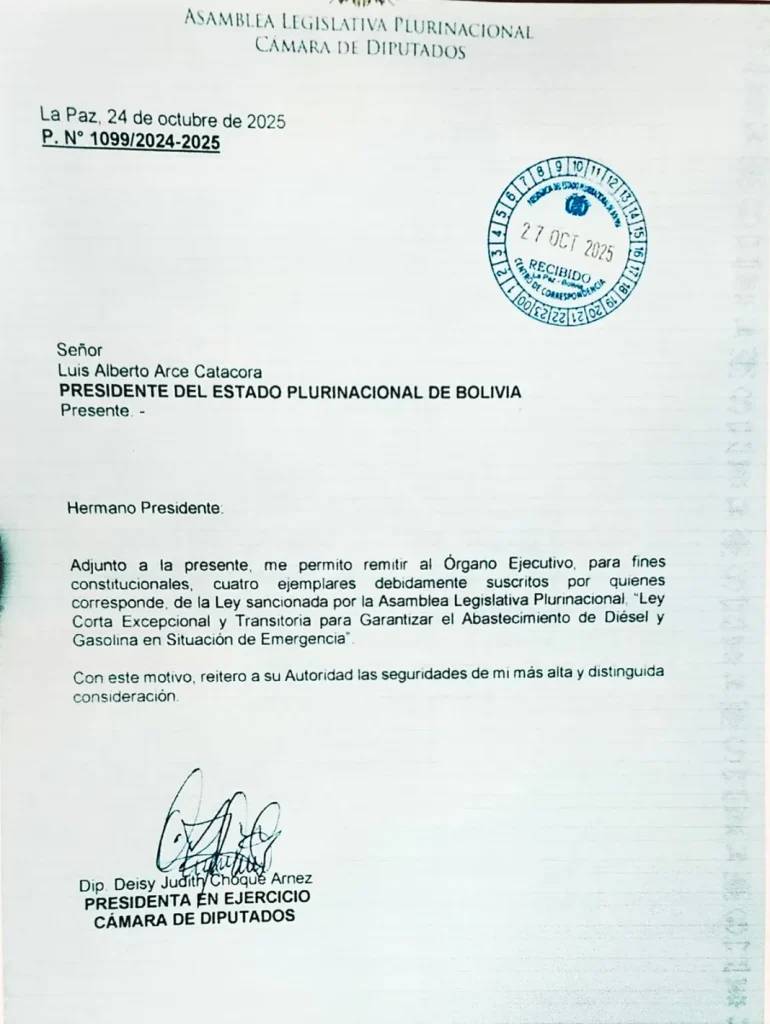 El viceministro de Coordinación Gubernamental, Gustavo Torrico, confirmó este lunes 27 de octubre de 2025 que la “Ley Corta Excepcional y Transitoria para Garantizar el Abastecimiento de Combustibles” ya ha sido enviada al Órgano Ejecutivo. Torrico aseguró que el Gobierno no detendrá su promulgación.