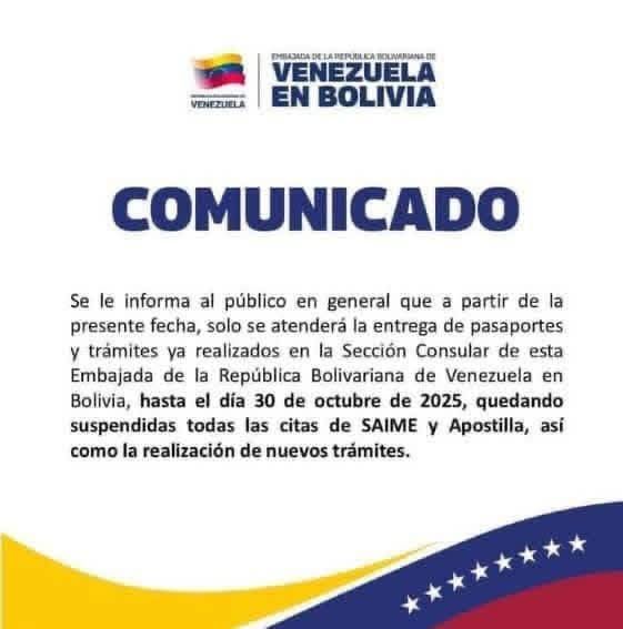 La Embajada de Venezuela en Bolivia ha decidido suspender todos los trámites relacionados con el Servicio Autónomo de Identificación, Migración y Extranjería (Saime), así como los procesos de apostilla. Esta medida se toma a pocos días de la posesión del Presidente electo Rodrigo Paz Pereira.
