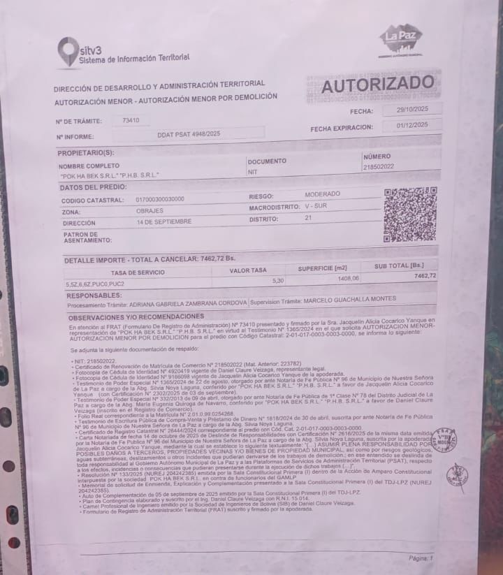 El alcalde de La Paz, Iván Arias, ha expresado su rechazo a la decisión judicial. Sostuvo que el municipio se vio obligado a emitir el permiso de demolición.