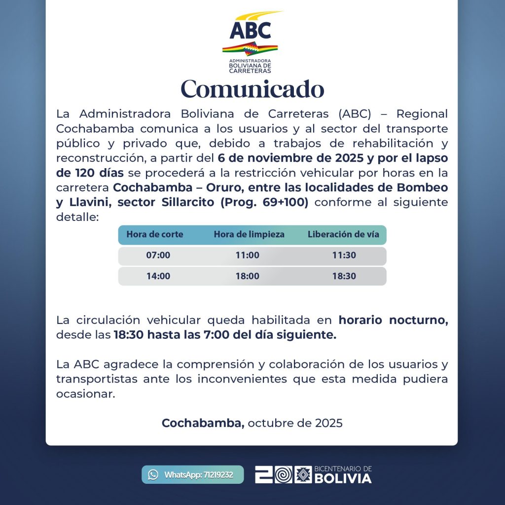 Desde este jueves 6 de noviembre de 2025, se llevarán a cabo cortes intercalados en la carretera Cochabamba–Oruro, específicamente en el tramo que va desde Bombeo hasta Llavini, en el sector Sillacitto. Esta información fue anunciada por la Administradora Boliviana de Carreteras (ABC) Regional Cochabamba. Se estima que esta medida tendrá una duración aproximada de 120 días.