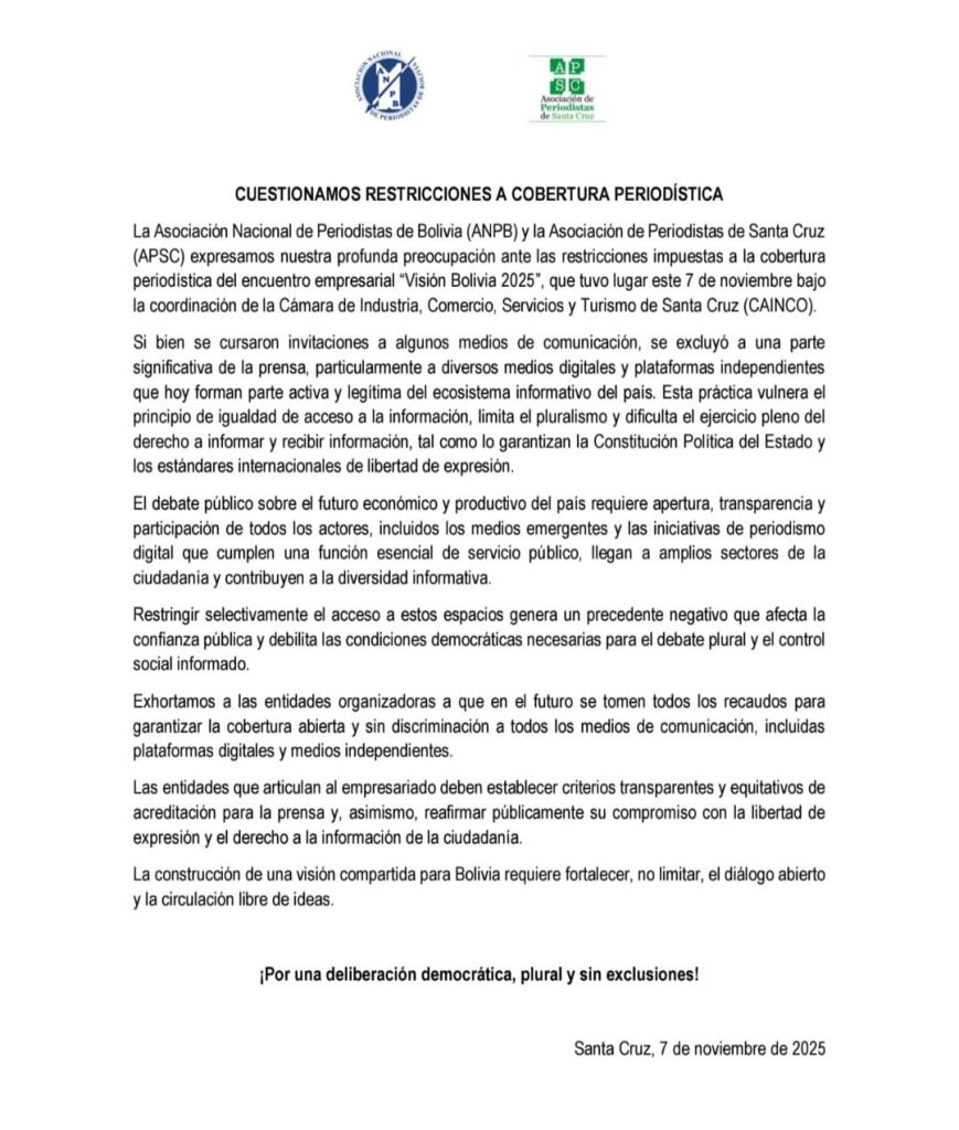 La Asociación Nacional de Periodistas de Bolivia (ANPB) y la Asociación de Periodistas de Santa Cruz (APSC) han emitido una declaración conjunta el 7 de noviembre de 2025. En este comunicado, cuestionan las restricciones impuestas a la cobertura periodística durante el evento empresarial “Visión Bolivia 2025”, que fue coordinado por la Cámara de Industria, Comercio, Servicios y Turismo de Santa Cruz (Cainco).