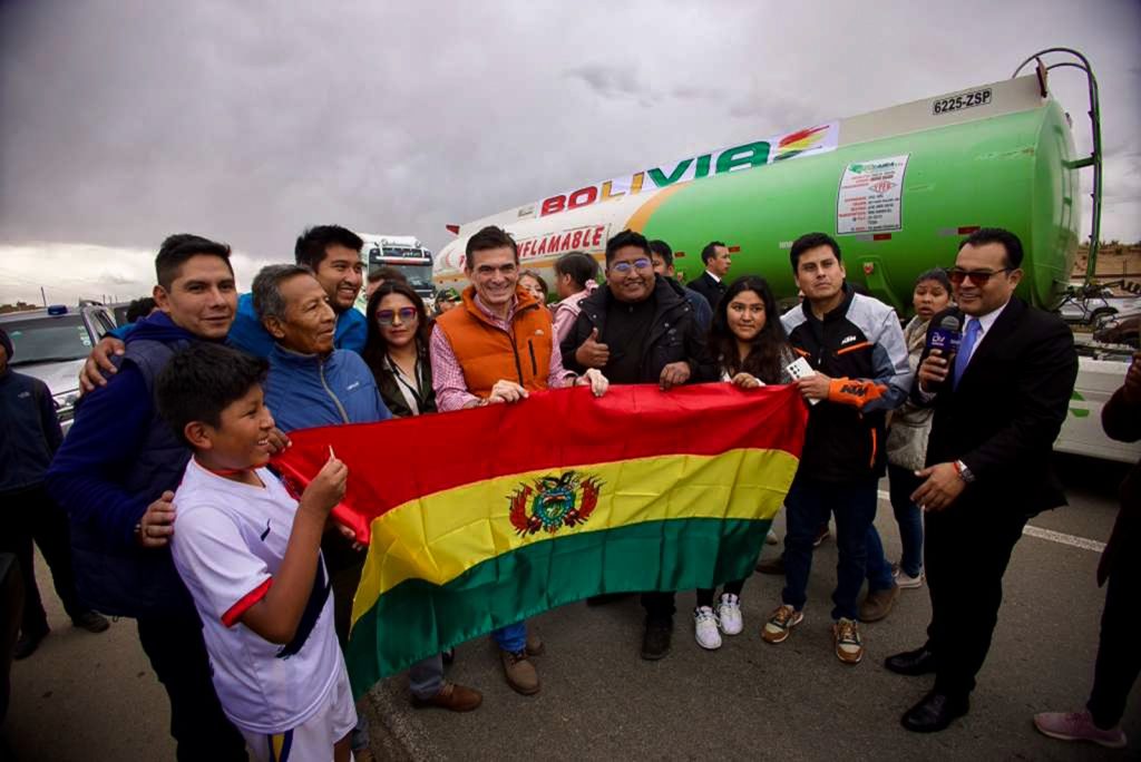 El Presidente del Estado, Rodrigo Paz, encabezó este domingo 9 de noviembre el recibimiento de los camiones cisterna que transportan gasolina y diésel hacia el país. Se prevé la llegada de 600 camiones cisternas.