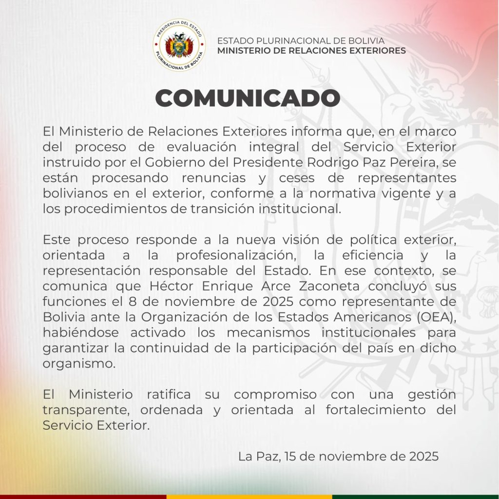 Según el comunicado emitido por la Cancillería, la salida de Arce se formalizó el 8 de noviembre. Este cambio se enmarca dentro de un proceso de evaluación integral del Servicio Exterior que está siendo impulsado por el Gobierno de Rodrigo Paz Pereira.