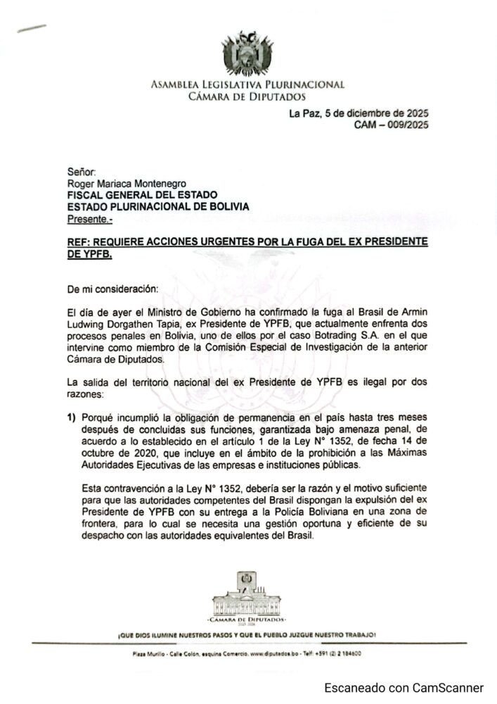 Diputado Alarcón envía notas a fiscal general y al canciller para que Dorgathen sea traído a Bolivia/ RR.SS