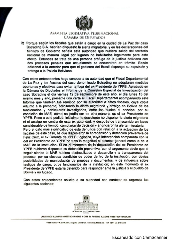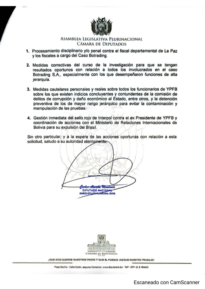 Alarcón también mencionó que ha enviado notas oficiales al fiscal departamental de La Paz desde el 15 de septiembre. En estas notas, solicitó medidas cautelares sobre los bienes y personas mencionadas en el informe del caso Botrading. Sin embargo, consideró que los avances en este asunto han sido “insignificantes” y acusó a los fiscales de actuar con lentitud.