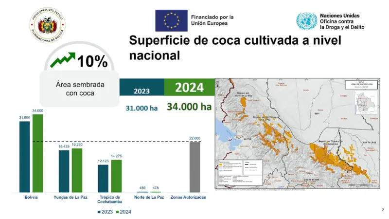 Este lunes 15 de diciembre de 2025, se presentó el Informe de Monitoreo de Cultivos de Coca 2024 en un evento realizado en la Cancillería de Bolivia. En el informe del año anterior, 2023, se había reportado una superficie de 31.000 hectáreas de hoja de coca, lo que indica un incremento del 10% en el área cultivada.
