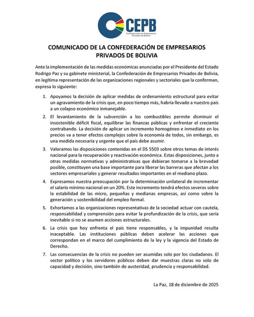 La Confederación de Empresarios Privados de Bolivia (CEPB) expresó este jueves su apoyo formal a las medidas de ordenamiento implementadas por el Gobierno a través del Decreto Supremo 5503.