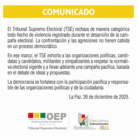 El Tribunal Supremo Electoral (TSE) de Bolivia ha decidido romper el silencio en relación con los incidentes violentos que se han registrado en el oriente del país. A través de un comunicado oficial, el TSE ha censurado de manera categórica cualquier acto de agresión, ya sea física o verbal, en el contexto de las Elecciones Subnacionales 2026.