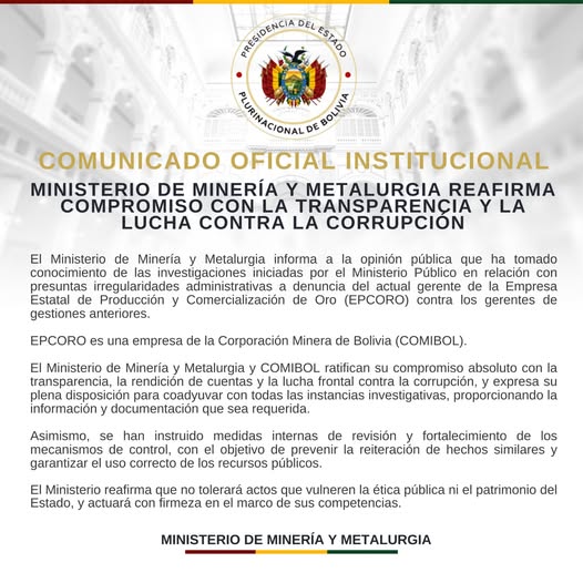 El Ministerio de Minería y Metalurgia, junto con la Corporación Minera de Bolivia (Comibol), reafirmaron su “compromiso absoluto” con la transparencia, la rendición de cuentas y la lucha contra la corrupción. También expresaron su “plena disposición” para colaborar con todas las instancias investigativas, proporcionando la información y documentación que se requiera.