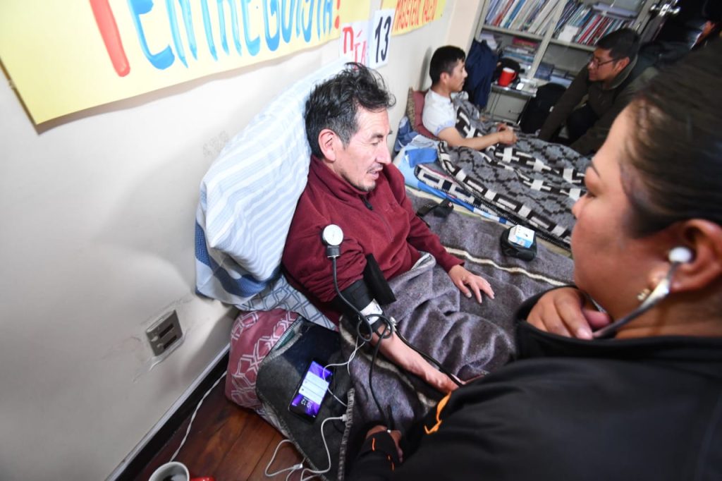 El secretario ejecutivo de la COD La Paz, Félix Nina, llegó hasta el piquete para exhortar a los huelguistas a deponer la medida por razones de salud. La dirigencia sindical también anunció que realizará gestiones similares con otro piquete que está instalado en la sede de la Central Obrera Boliviana.