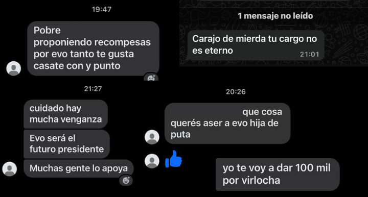 Según Mallón, los mensajes que ha recibido incluyen amenazas con un claro tinte político, como: “cuidado, hay mucha venganza, Evo Morales será el futuro presidente”. Sin embargo, la mayoría de los ataques están dirigidos a su condición de mujer.