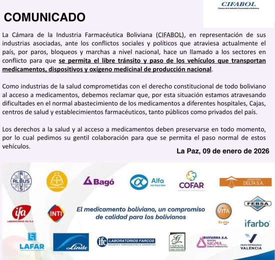 Cifabol urge a sectores en conflicto a permitir el paso de insumos médicos vitales para asegurar la salud pública en Bolivia.